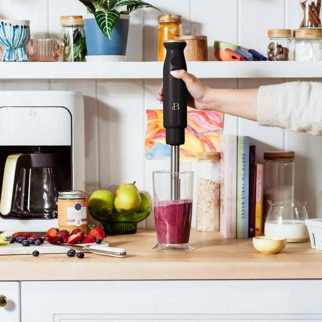 Blend, chop, whisk and more. The 2-Speed Immersion Blender by Drew Barrymore comes with a 2-cup chopper and 24 oz measuring cup for precise measurements. The Immersion Blender features an 8" detachable blending shaft that fits into your deepest pots and pans. An extra-long 5" cord that allows you to move around your workstation with ease. Created by Drew Barrymore