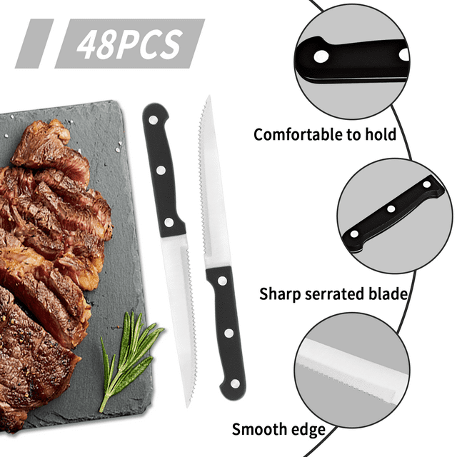 Excellent value.The steak knives' sharp serrated teeth make it easy to cut steak or remove turkey. Also, the steak knives have rounded, curved handles that are ergonomically designed for a comfortable grip while cutting.