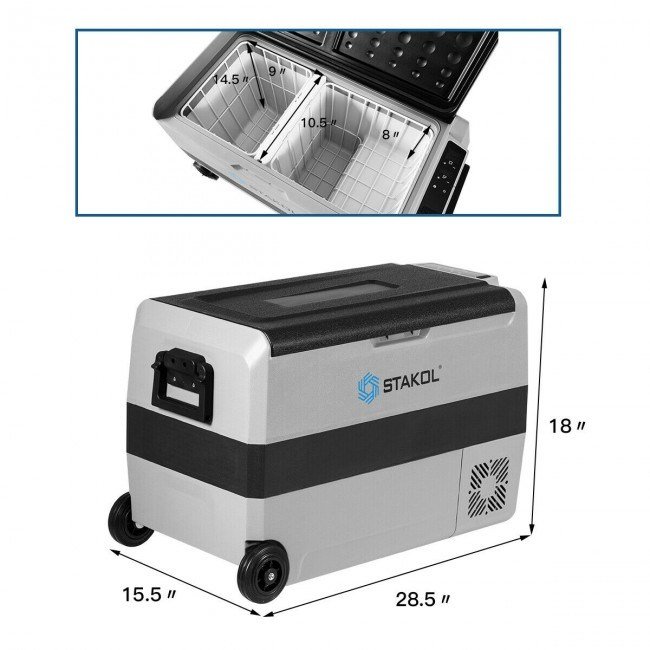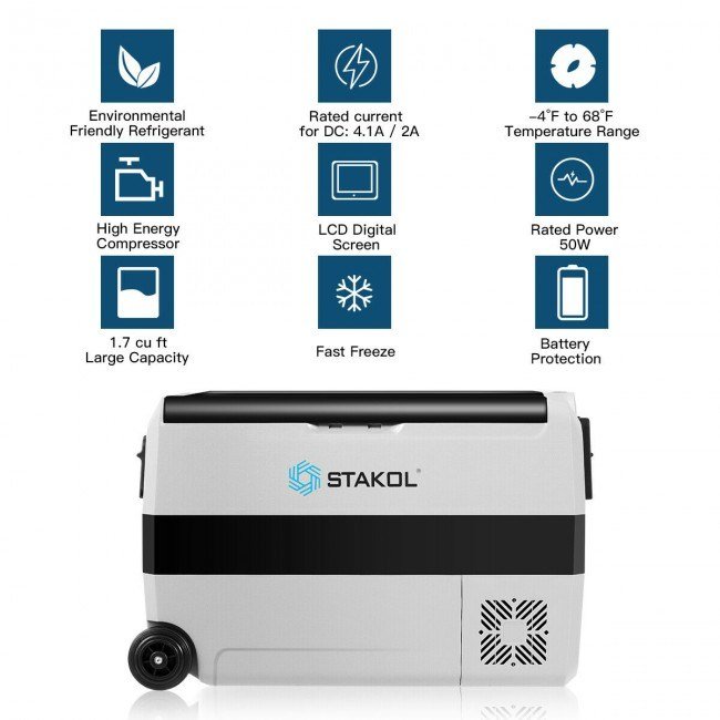 With a capacity of 1.7 cu ft for you to store drinks, food, beverages, etc.Perfect for your RV, travelling, camping, or your home, office and more2 separate areas, one area is used for refrigeration and one area is used for freezingEasy-to-operate display panel for easy operating-4°F to 68°F controllable temperature rangeFreely switch between Fahrenheit and Celsius on the display panelHigh-configuration compressor for faster cooling3-level battery protection to protect your vehicle batteryLow noise and low energy consumptionIncludes 2 power cords for 12 / 24 V DC and 100V to 240V AC input.Handles on both side for convenient transportationInternal lighting bulbs allow you to easily and accurately get foodAdapters, plugs and wires are UL certified