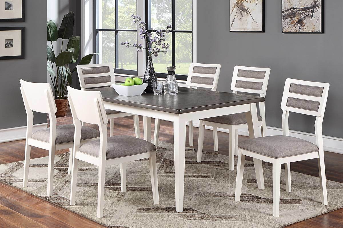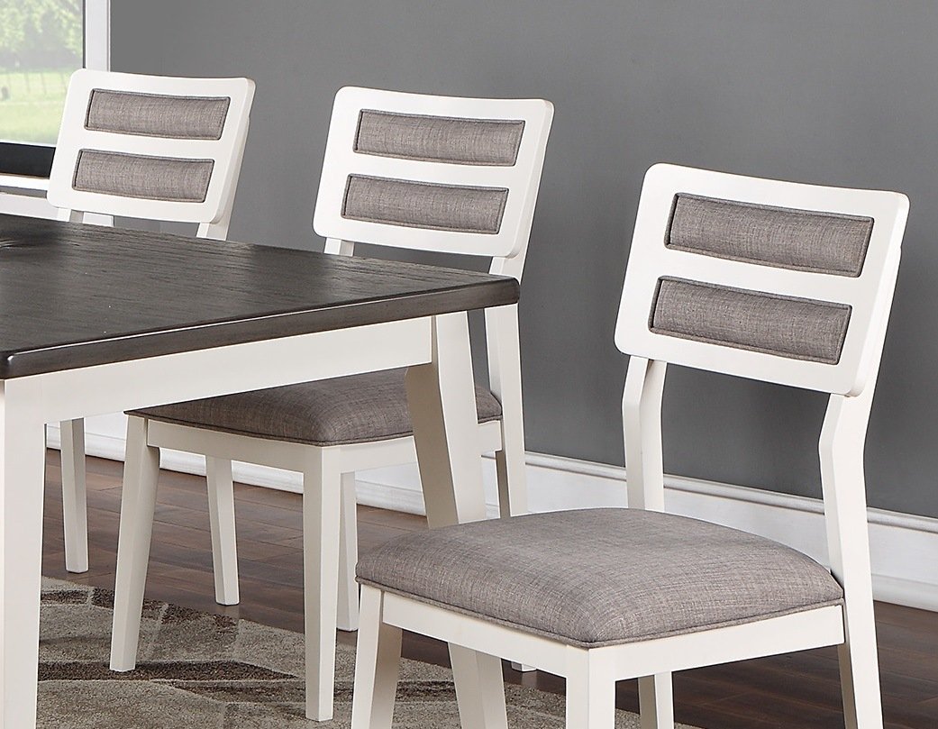 Prepare a picturesque scene of modern farmhouse living with this casual dining chair. The simplicity of the well-constructed furnishings raise the bar on any dining event. Tones of gray as the primary color with white (or dark brown) trim grace the rectangular shaped table (optional). The uniquely designed chairs features upholstered seats with ladder back supports. This set features seating optional for up to six guest making it a great choice for small and large gatherings.