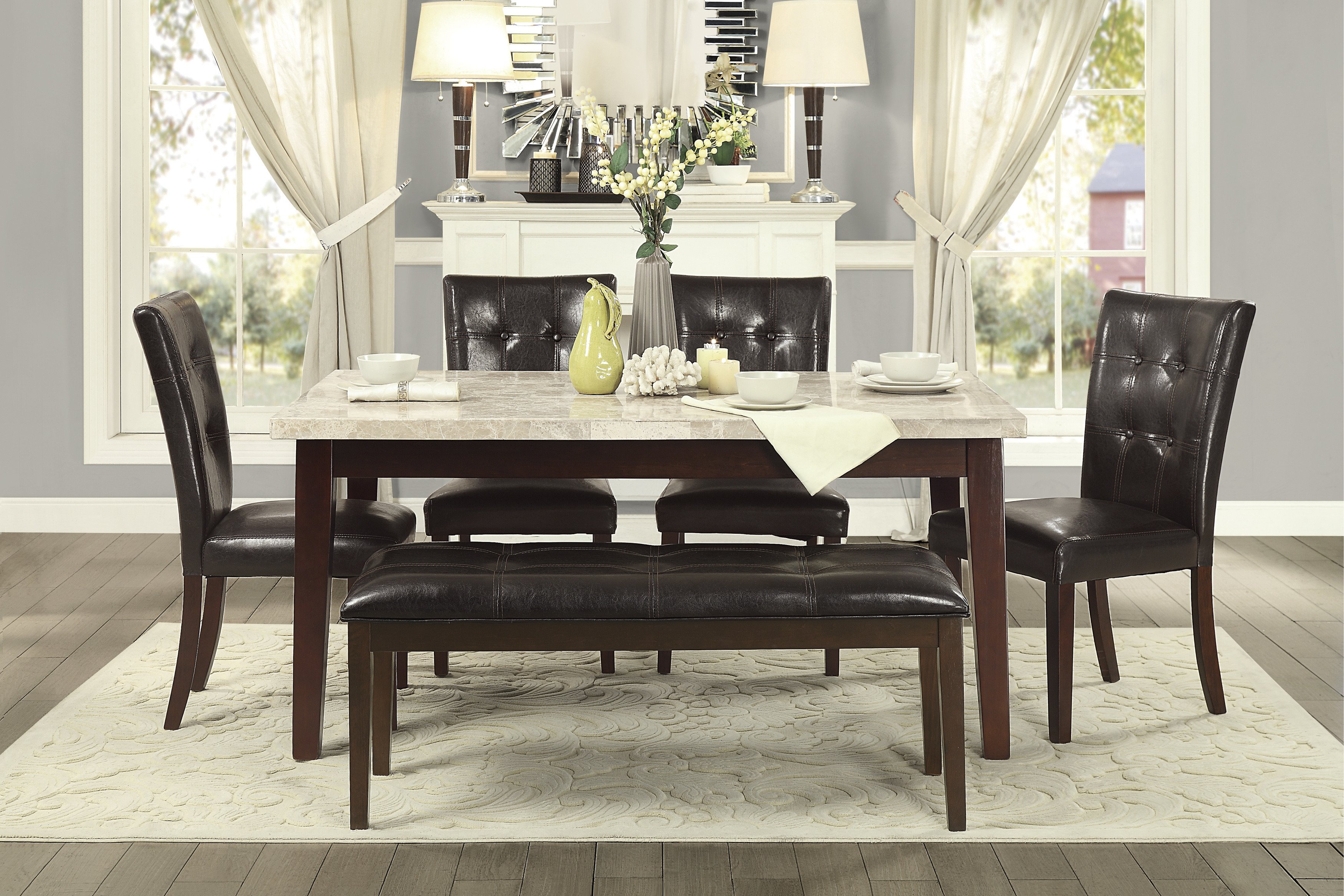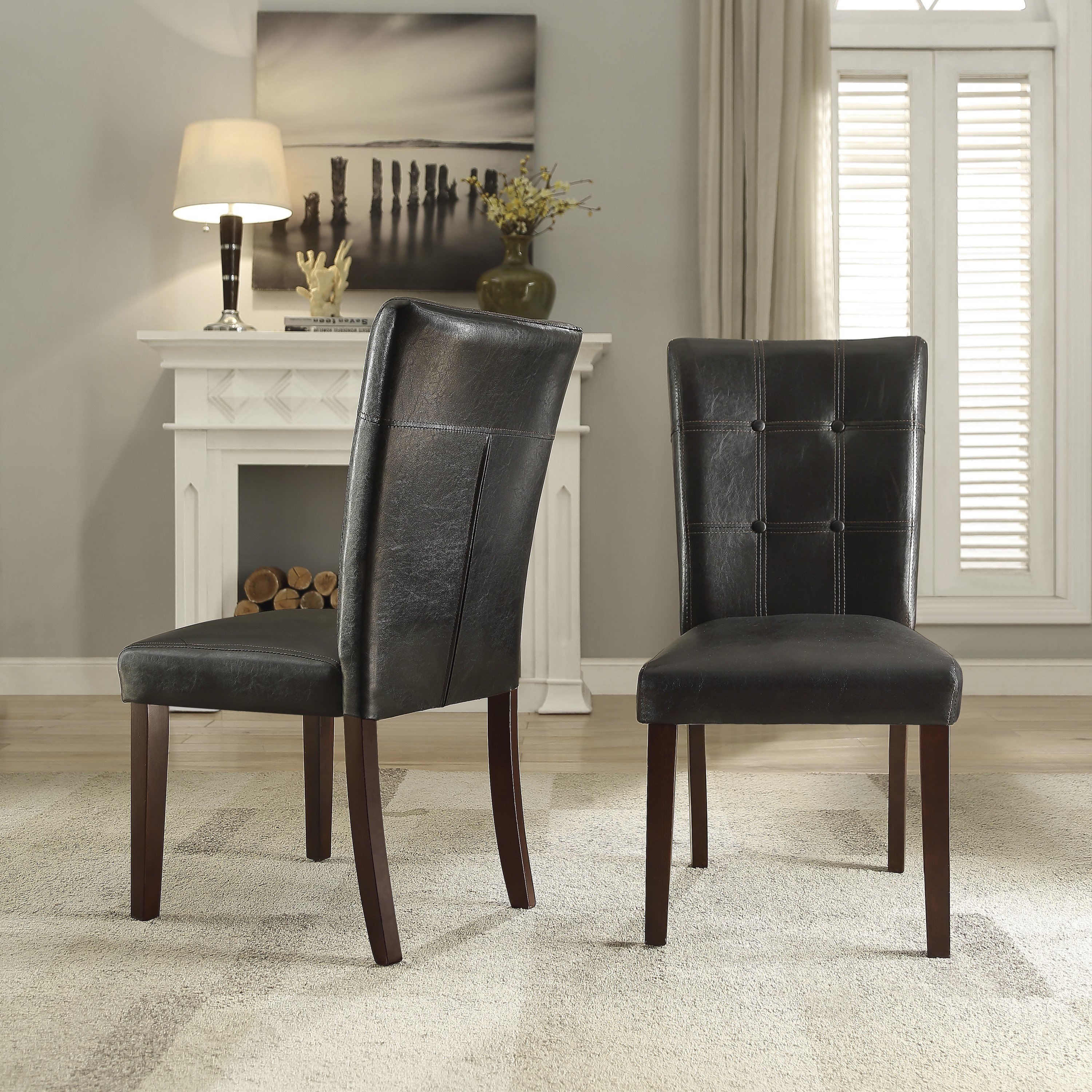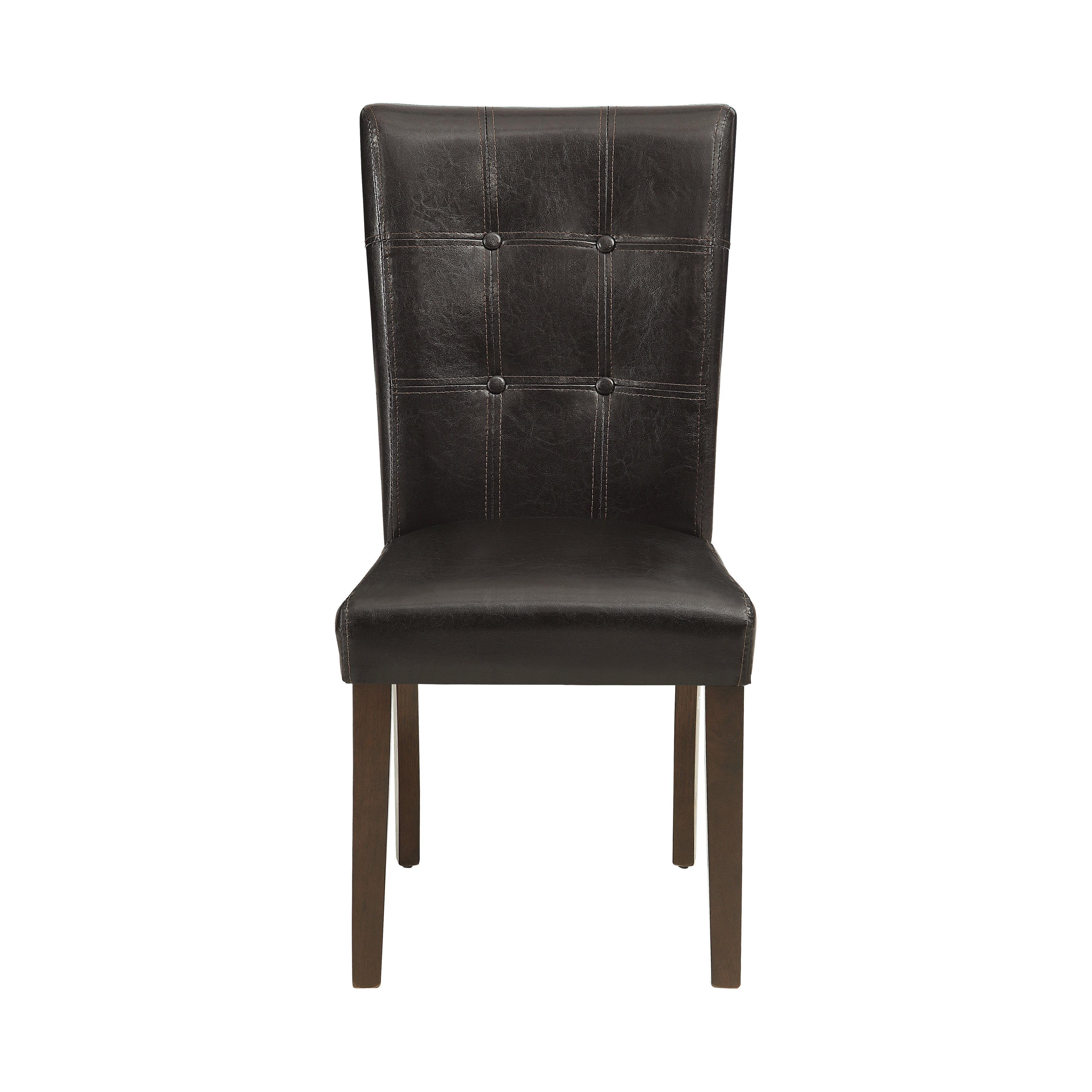 Description & DimensionsThe casual Decatur Collection is the transitional style that you have been searching for in your dining space. Basswood veneer covers the legs, with dark cherry finish, that support the classic profile of the chair seat, which is covered in dark brown faux leather, with tufted accenting.PRODUCT DIMENSIONS: Overall Dimension: 19" x 25" x 38.5"HSeat Width: 19"Seat Depth: 17.5"Seat Height: 19"Listing Includes: Set of 2 Side Chairs Only.Dining Table: Not included.Simple Assembly Require