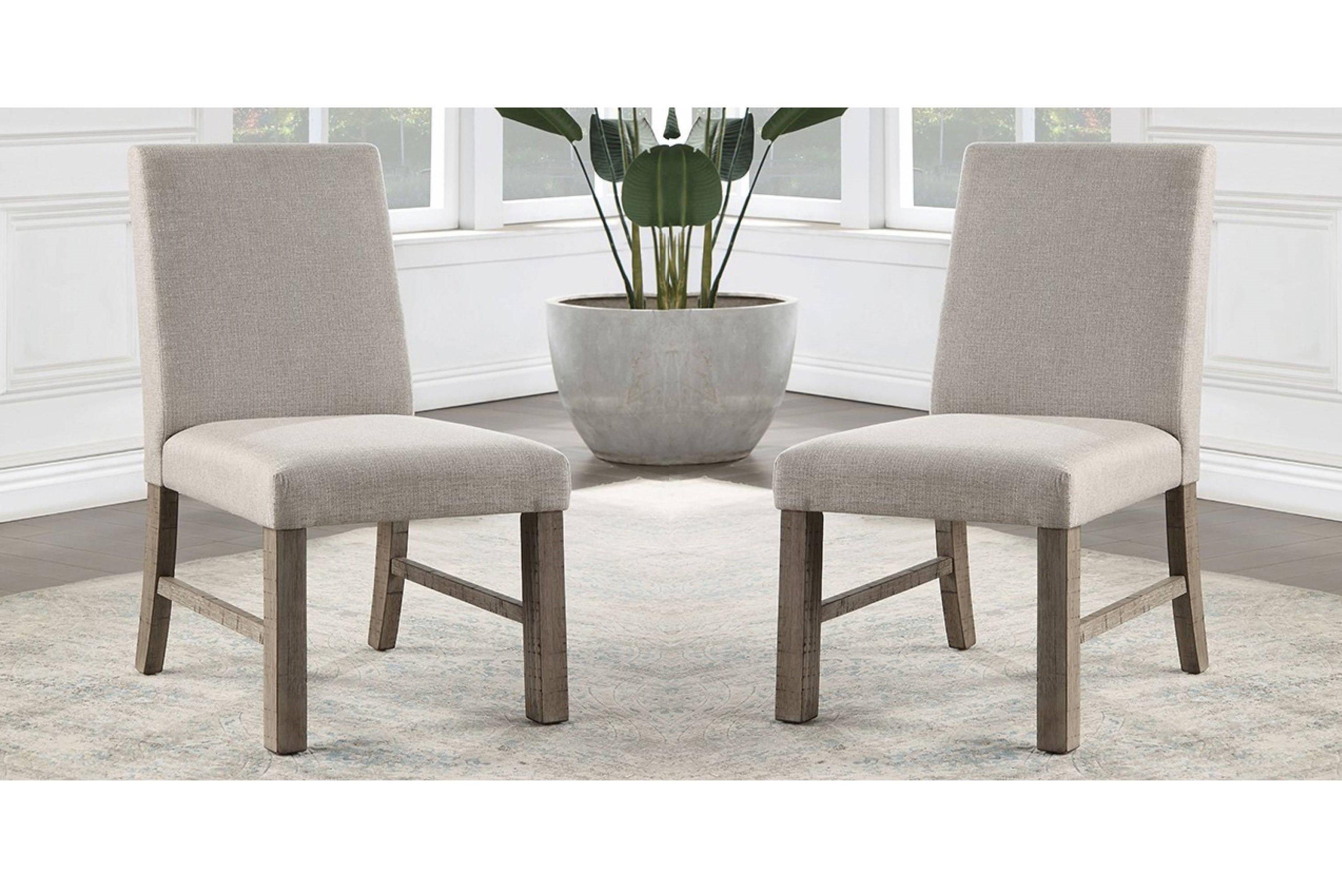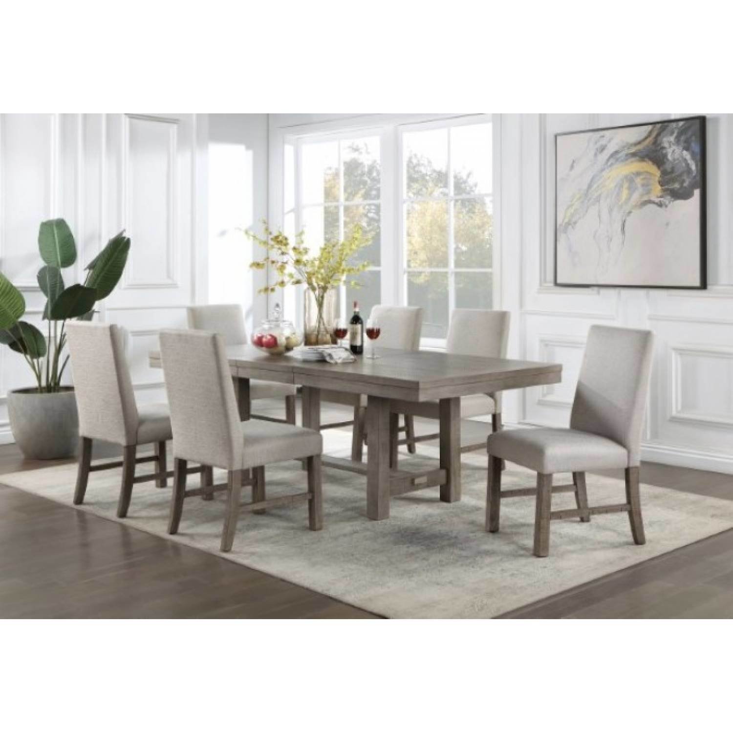 Add a touch of rustic elegance to your dining room with this standout collection. Padded fabric upholstery on the matching chair in a lighter shade of gray adds a subtle, monochromatic flair to the neutral gray finish of the wooden parts.