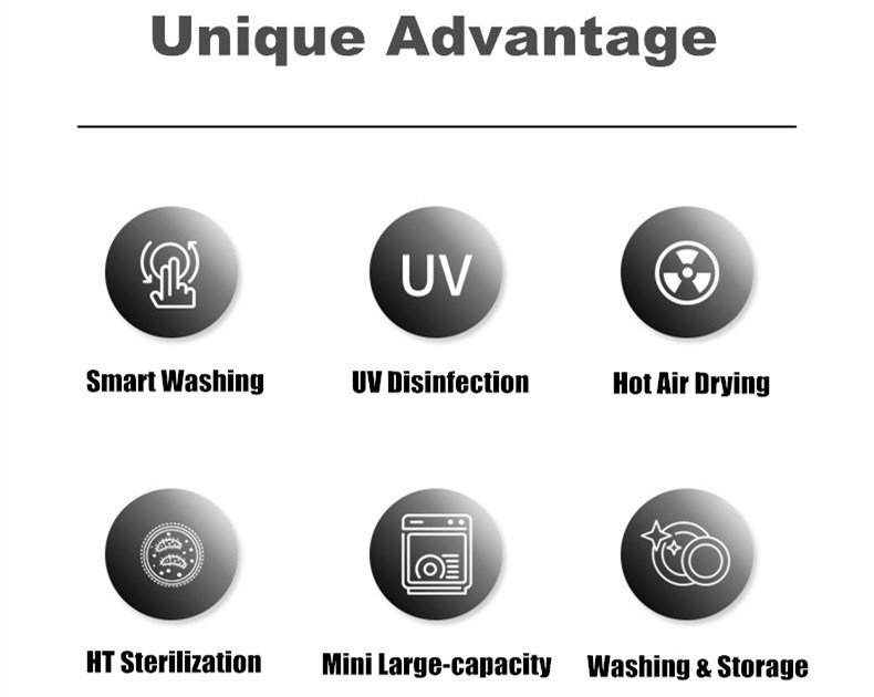 This is a multifunctional household desktop dishwasherwith cleaning, disinfection, drying, storage, and free-installation, which adopts food-grade polymer material, anti-dry burning device, anti-leakage alarm device, door buffer structure and protection device, up and down water column design, equipped with variable frequency high-lift pump, functional touch panel, ultraviolet light set, removable shelf, transparent window in the middle. And strong scouring, four cleaning modes, three layers of disinfection, automatic 72-hour air exchange function, clean tableware is better.