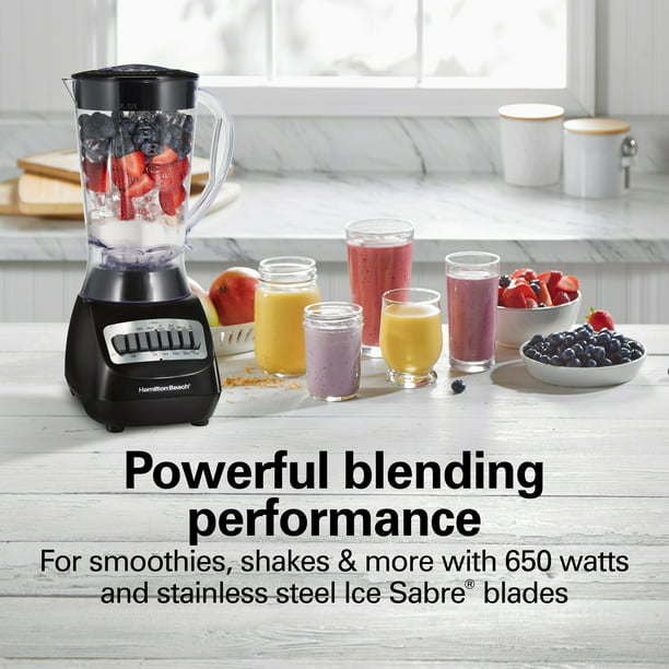 Powerful blending performance: with 650 watts of peak power and durable, patented ice sabre® blades to power through ice, the hamilton beach blender effortlessly blends a variety of ingredients to make smoothies, shakes, icy drinks, salsas and more.