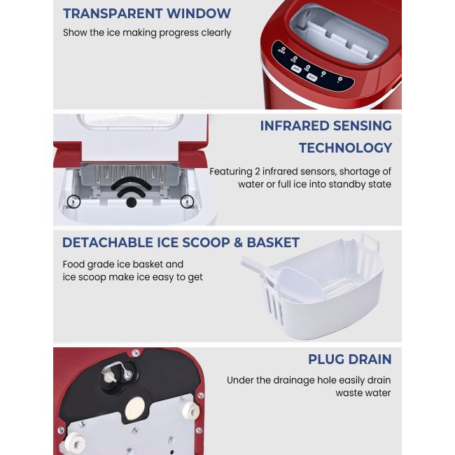 Equipped with a powerful compressor and 9 evaporator columnsWith a 2.2 L water tank, 9 ice cubes will be made within 6-13 minutesCan make up to 26 lbs ice in 24 hoursThe giant ice storage capacity of 1.5lbs Intelligent function with ice-full indicator and water shortage indicatorThe water level mark suggests the right water height and ensures regular useEvaporator column of the nickel-plated surface with R134a refrigerantAutomatic shut-off function when ice basket fullTransparent viewing window, removable ice basket and ice scoopClear control panel, easy to useTransparent windows provide an excellent view to look insideRound and smooth ice, don't hurt mouthHollow Design for better use Big and small size available for different useCan cool drinks, food and make fruits smoothies and moreHelpful for medical treatment and first aid Portable and compact, easy to carryA wide range of personal and commercial use 55 DB low operating noiseFood grade material ensures the safety and healthy ETL certified and FDA certified
