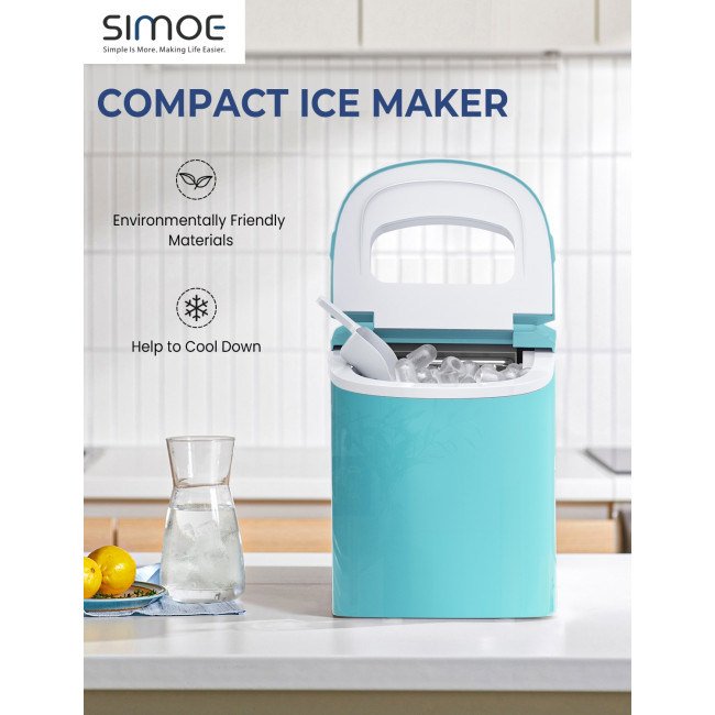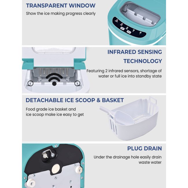 Equipped with a powerful compressor and 9 evaporator columnsWith a 2.2 L water tank, 9 ice cubes will be made within 6-13 minutesCan make up to 26 lbs ice in 24 hoursThe giant ice storage capacity of 1.5lbs Intelligent function with ice-full indicator and water shortage indicatorThe water level mark suggests the right water height and ensures regular useEvaporator column of the nickel-plated surface with R134a refrigerantAutomatic shut-off function when ice basket fullTransparent viewing window, removable ice basket and ice scoopClear control panel, easy to useTransparent windows provide an excellent view to look insideRound and smooth ice, don't hurt mouthHollow Design for better use Big and small size available for different useCan cool drinks, food and make fruits smoothies and moreHelpful for medical treatment and first aid Portable and compact, easy to carryA wide range of personal and commercial use 55 DB low operating noiseFood grade material ensures the safety and healthy ETL certified and FDA certified