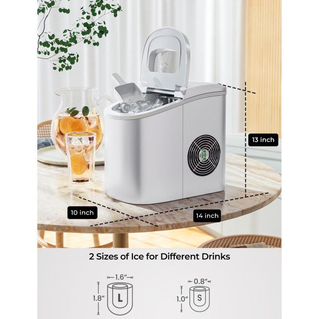 4.Portable Compact Size and Low Noise Running: This ice maker is 9.5" x 14" x 13" in size and 17.5lbs in weight. With a quiet compressor that requires low energy to cool and its space-saving design, this ice maker will be a great addition to your bar or countertop.
