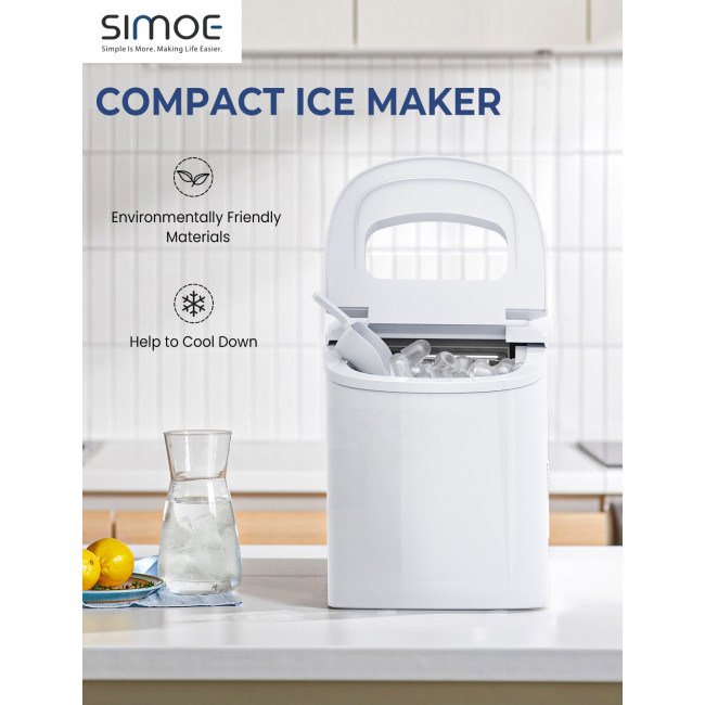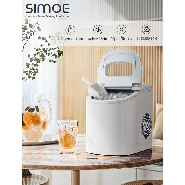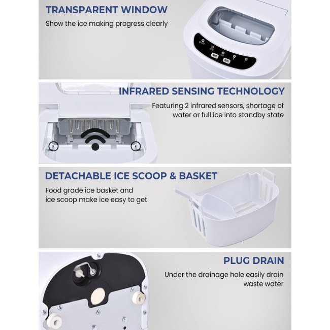 Equipped with a powerful compressor and 9 evaporator columnsWith a 2.2 L water tank, 9 ice cubes will be made within 6-13 minutesCan make up to 26 lbs ice in 24 hoursThe giant ice storage capacity of 1.5lbs Intelligent function with ice-full indicator and water shortage indicatorThe water level mark suggests the right water height and ensures regular useEvaporator column of the nickel-plated surface with R134a refrigerantAutomatic shut-off function when ice basket fullTransparent viewing window, removable ice basket and ice scoopClear control panel, easy to useTransparent windows provide an excellent view to look insideRound and smooth ice, don't hurt mouthHollow Design for better use Big and small size available for different useCan cool drinks, food and make fruits smoothies and moreHelpful for medical treatment and first aid Portable and compact, easy to carryA wide range of personal and commercial use 55 DB low operating noiseFood grade material ensures the safety and healthy ETL certified and FDA certified