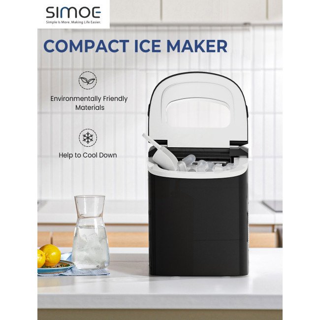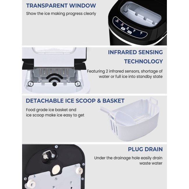 Equipped with a powerful compressor and 9 evaporator columnsWith a 2.2 L water tank, 9 ice cubes will be made within 6-13 minutesCan make up to 26 lbs ice in 24 hoursThe giant ice storage capacity of 1.5lbs Intelligent function with ice-full indicator and water shortage indicatorThe water level mark suggests the right water height and ensures regular useEvaporator column of the nickel-plated surface with R134a refrigerantAutomatic shut-off function when ice basket fullTransparent viewing window, removable ice basket and ice scoopClear control panel, easy to useTransparent windows provide an excellent view to look insideRound and smooth ice, don't hurt mouthHollow Design for better use Big and small size available for different useCan cool drinks, food and make fruits smoothies and moreHelpful for medical treatment and first aid Portable and compact, easy to carryA wide range of personal and commercial use 55 DB low operating noiseFood grade material ensures the safety and healthy ETL certified and FDA certified