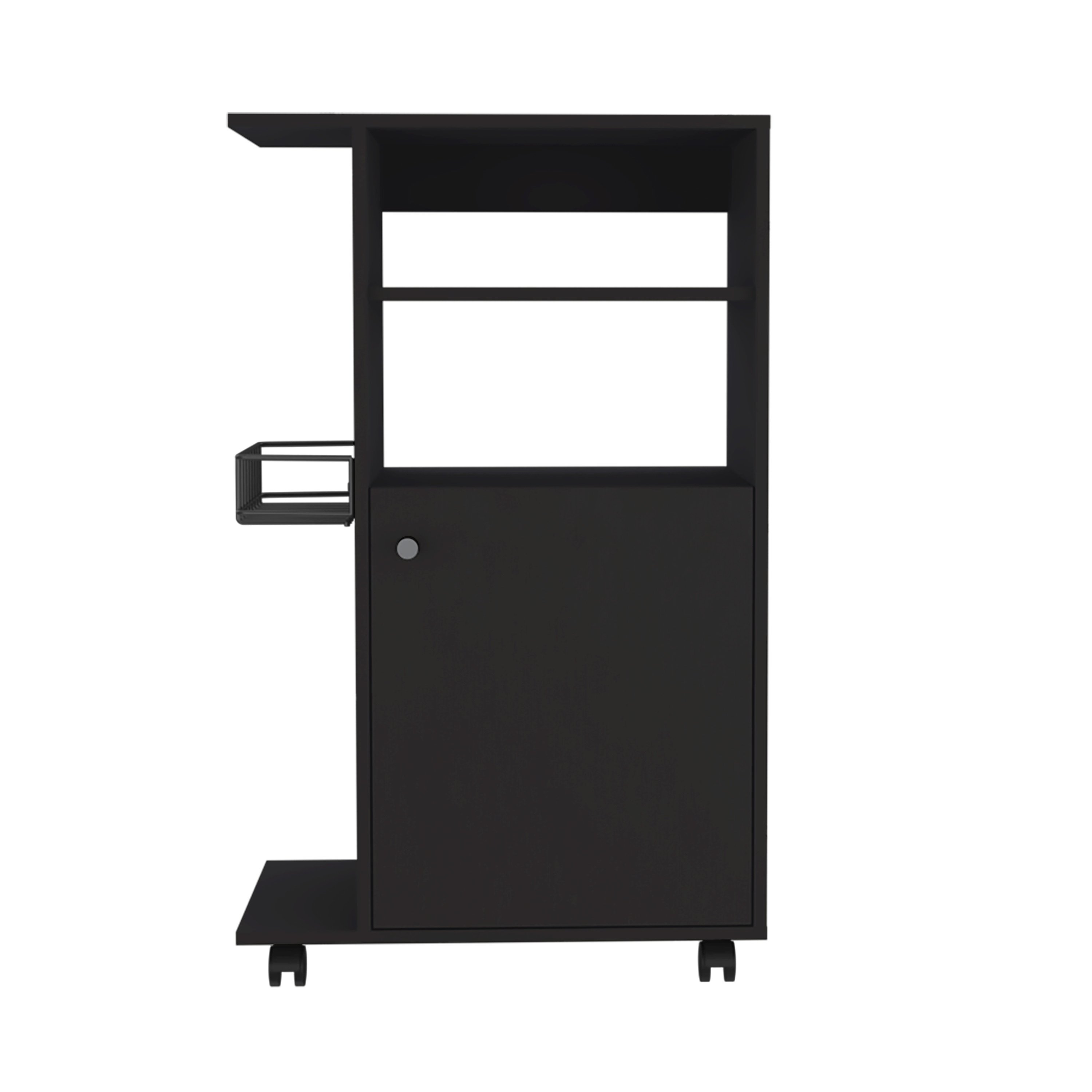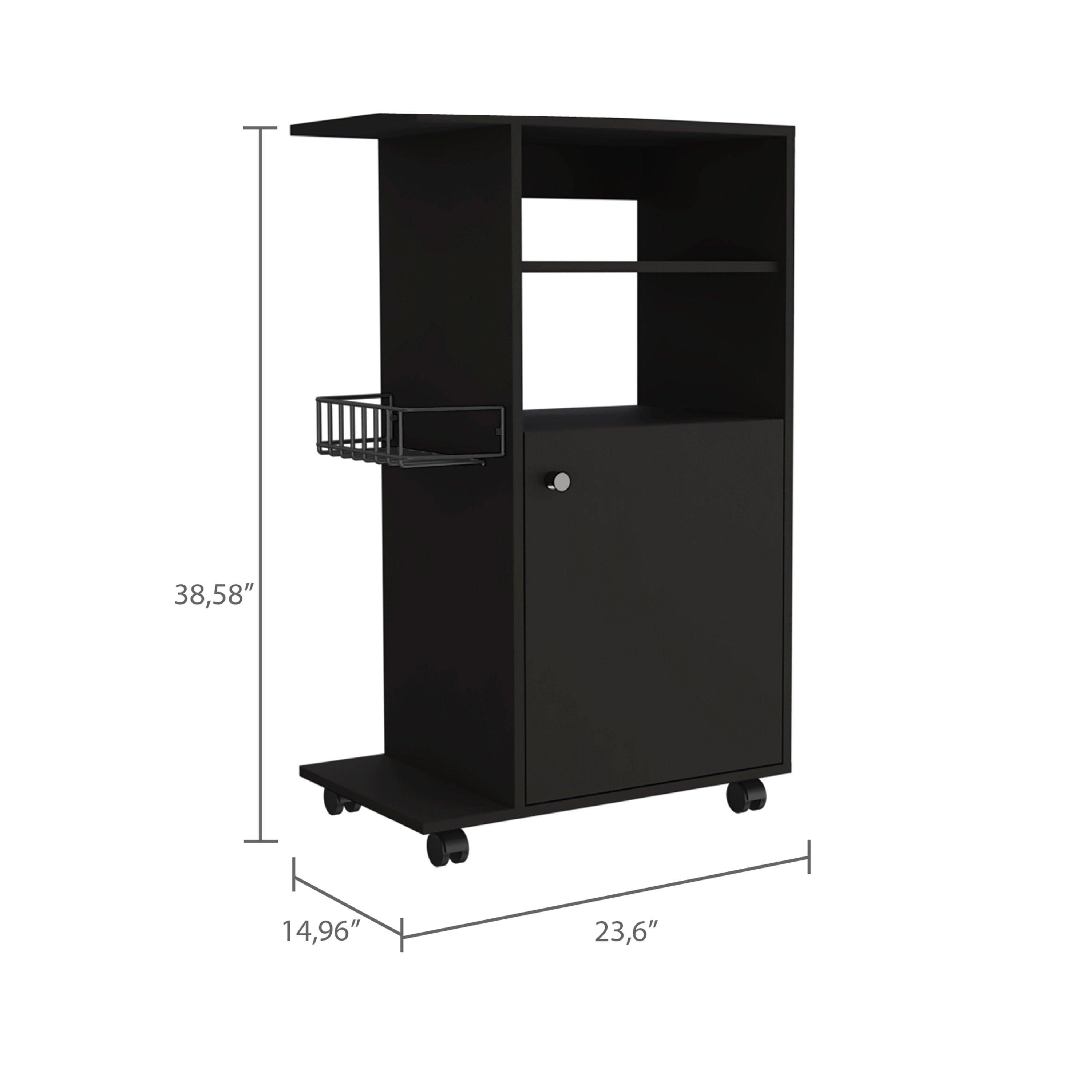 Romance CopyThe idea of adding extra storage to your kitchen becomes a reality with this ergonomic cart. The countertop design is specifically for the microwave and can be moved about as needed owing to the four caster wheels. It is both stylish and functional, with a large storage capacity and rack for extra storage.Product DetailsSet includesOne (1) kitchen cartDimensions38.58 inches high x 23.6 inches wide x 14.96 inches deepFinish ColorBlack WengueMaterialsManufactured woodNumber of shelves6Number of doors1