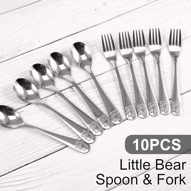 Child-friendly fork and spoon set this children's silverware set includes 5 toddler spoons and 5 toddler forks. The forks measure 6.3 x 0.9 inches and the spoons measure 6.3 x 1.3 inches and fit your child's small mouth and fingers for an easy grip.