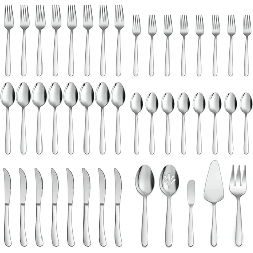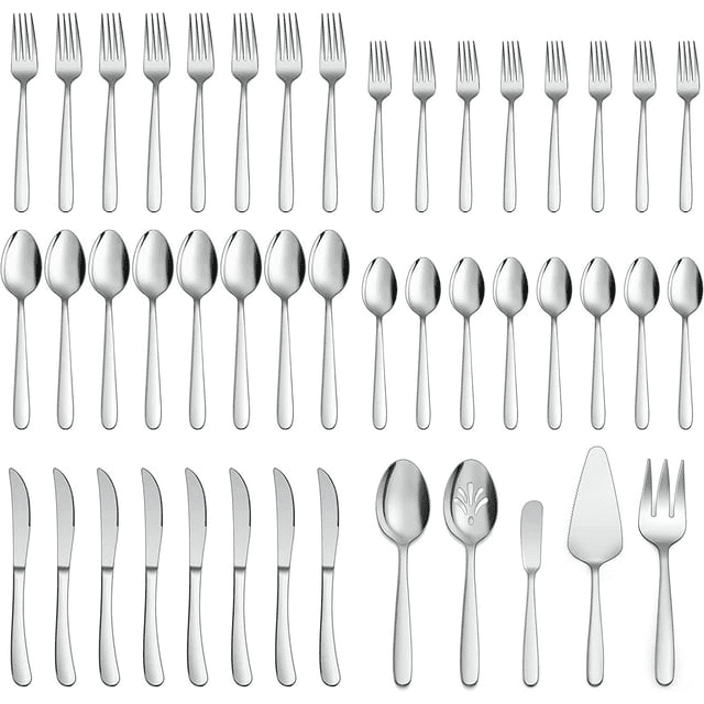 Vesteel 45-piece heavy duty silverware set is made of high-class stainless steel, rust resistant, thick and sturdy structure will last a long lifetime. Heavier weight will provide you great hand feeling. Classy appearance always keep shiny with mirror polished. Concise design without any redundant pattern can match your existing table settings harmoniously. Additional 5 serving utensils, multipurpose use for formal and casual occasions. These eating utensils are really ideal for large family, restaurant, farmhouse, entertaining, wedding, buffet, party, picnic.