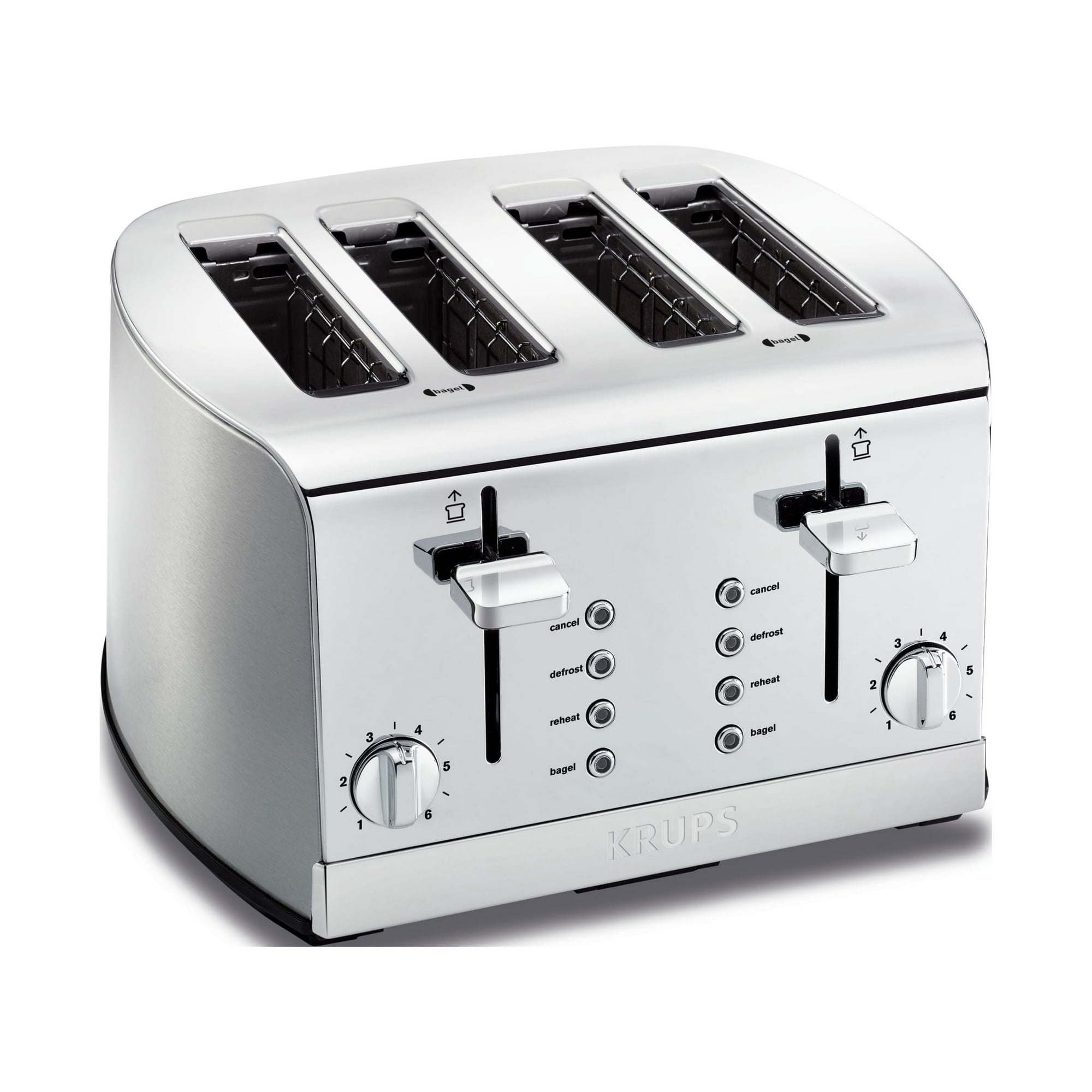 Equipped with enhanced features for outstanding customization, the new KRUPS 4-Slice Toaster gives your breakfast an upgrade, with enough for the whole family. A rotating knob with six browning levels comes together with extra-deep slots, for precise and perfectly even browning results that cover the entire slice. An integrated high-lift lever lets you easily remove your toast or bagel in total safety. Additional features include a 30-second reheat function, a defrost setting and a bagel setting for flawless toasting of bagels. Rounding it all off is a removable rear crumb tray for easy clean-up. This stainless steel toaster is the perfect way to start your day, with a hot, crunchy breakfast toasted to golden-brown perfection.
