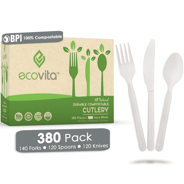 100% Compostable Forks Spoons and Knives - 380 Piece Eco Cutlery Combo Set - Eco Friendly Alternative to Plastic Silverware | Ecovita | White