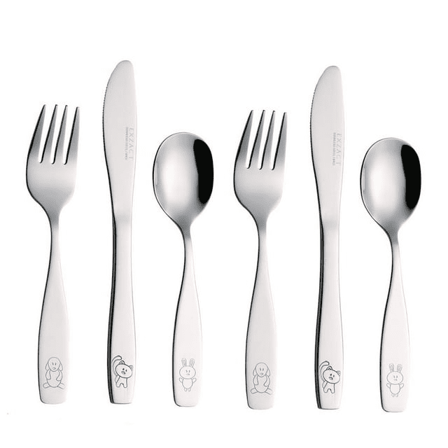 Exzact Children Flatware 6pcs Stainless Steel Silverware Set - Engraved Dog Cat Bunny Design