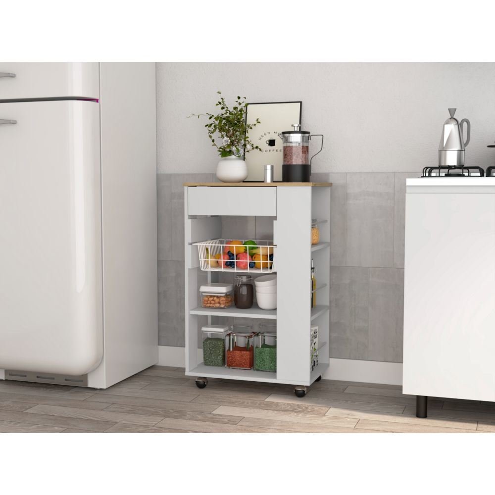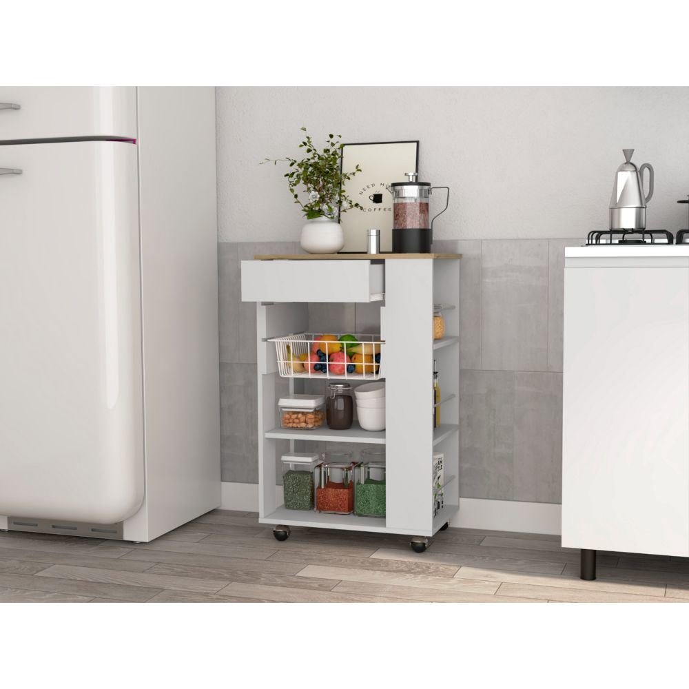 Romance CopyWith the extra kitchen gadgets and appliances taking up counter space these days, we've designed this one kitchen cart with tons of extra storage capacity to help declutter your countertops. The Prospect Kitchen Cart is easy to move around with its caster wheels, ample storages with two open shelves, one rack, and one drawer.Product DetailsSet includesOne (1) kitchen cartDimensions35.4 inches high x 22.4 inches wide x 14.5 inches deepFinish ColorWhite and Light OakMaterialsManufactured woodNumber of drawers1Number of shelves6