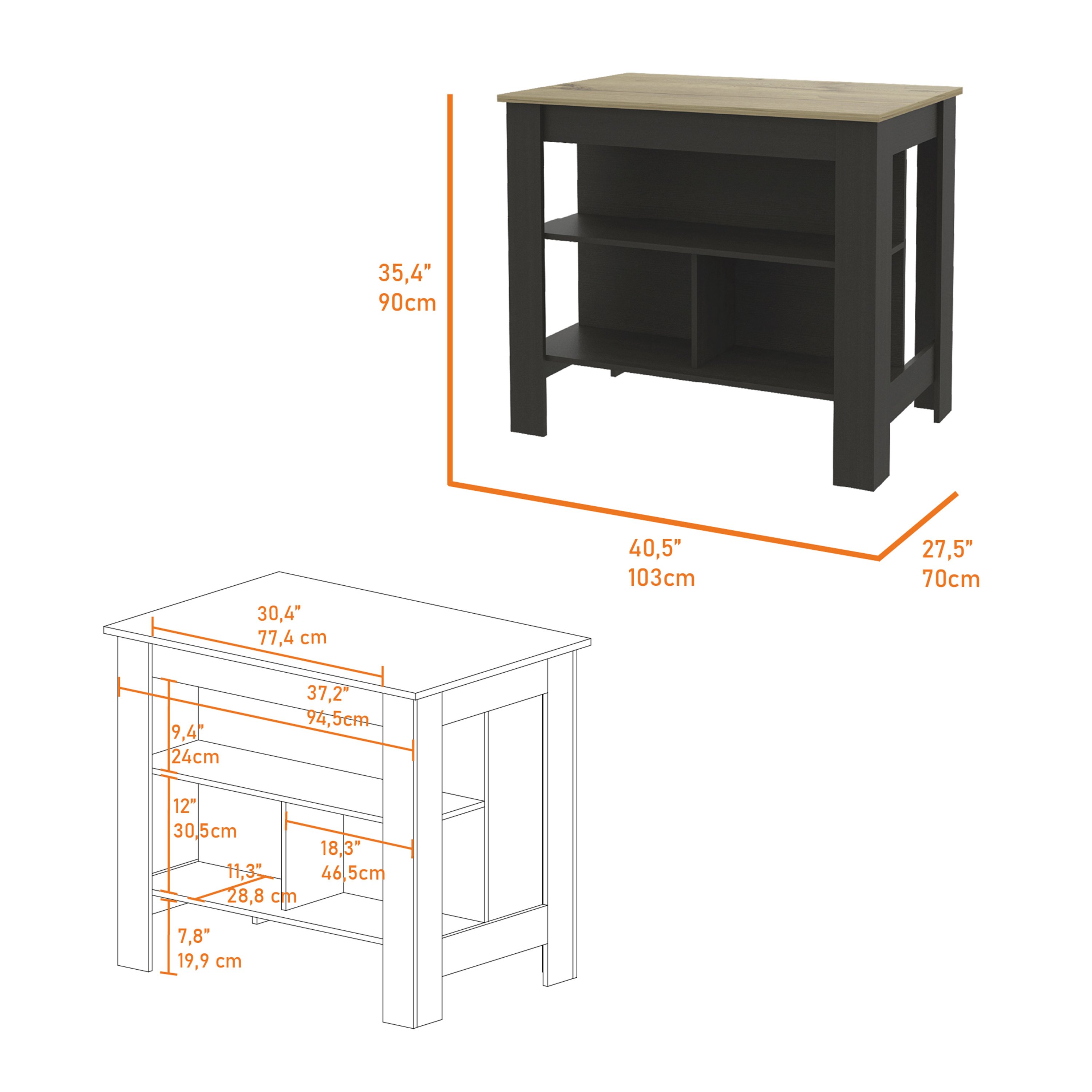 Romance CopyGet creative with the way you organize your kitchen by choosing this transitional kitchen island. Plenty of shelving keeps kitchen essentials on hand while this piece becomes your go-to for meal prepping.Product DetailsSet includesOne (1) kitchen islandDimensions35.4 inches high x 40.5 inches wide x 27.5 inches deepFinish ColorBlack Wengue and Light OakMaterialsManufactured woodNumber of shelves3
