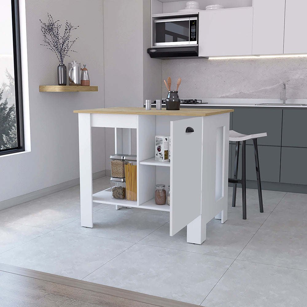 Romance CopyFor the modern kitchen, we've got just the thing to make your life a little more accessible: the Vancouver kitchen island. This stylish and convenient island offers a comprehensive and resistant top surface for all your preparations and a door that reveals two interior shelves. The open-side shelf is perfect for storing pots, pans, or any other culinary essentials you might need. With its sleek design, this kitchen island will surely be a hit in any home.Product DetailsSet includesOne (1) kitchen islandFinish colorWhite, MacadamiaMaterialsManufactured WoodProduct dimensions35.4"H x 40.5"W x 27.5"DNumber of doors1Number of shelves3