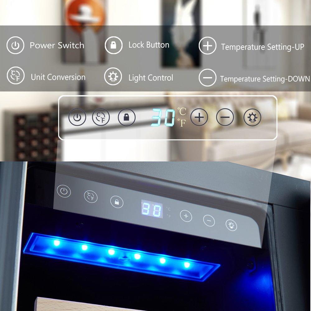 2.Dual zone: LED control display makes it easy to set temperature from 41-68°F, providing perfect chilling temperature all the time! The Left zone ranges from 41°F to 68° while the Right zone from 36°F to 50°F. You would not only just enjoy your wine but also enjoy your drink at the same time.